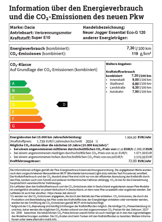 Dacia neuer Jogger ECO-G 120: Gesamtverbrauch kombiniert (l/100 km): 7,3 (5,8); CO2-Emission kombiniert (g/km): 119 (133); CO2-Klasse: D (D)