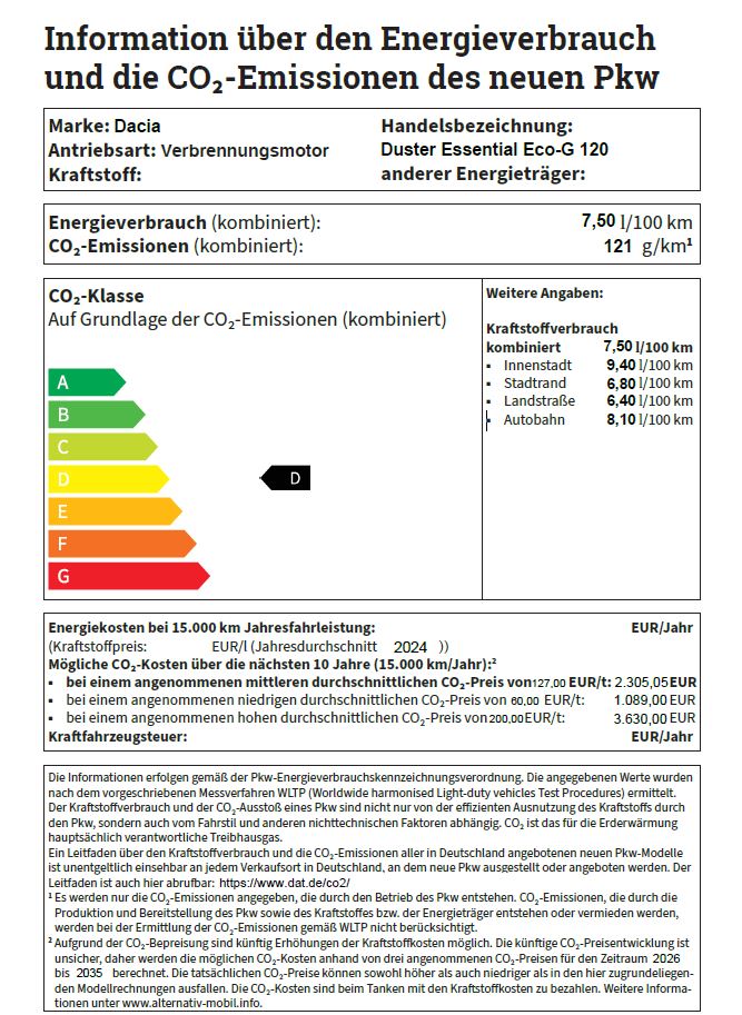 Neuer Dacia Duster ECO-G 120: Gesamtverbrauch kombiniert (l/100 km): 7,5 (6,0); CO2-Emission kombiniert (g/km): 121 (136); CO2-Klasse: D (E).