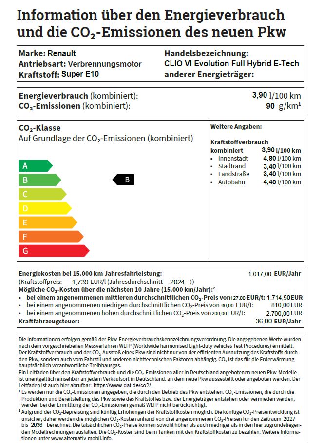 CLIO VI Evolution Full Hybrid E-Tech 160: Gesamtverbrauch kombiniert (l/100 km): 3,9; CO2-Emission kombiniert (g/km): 90; CO2-Klasse: B.