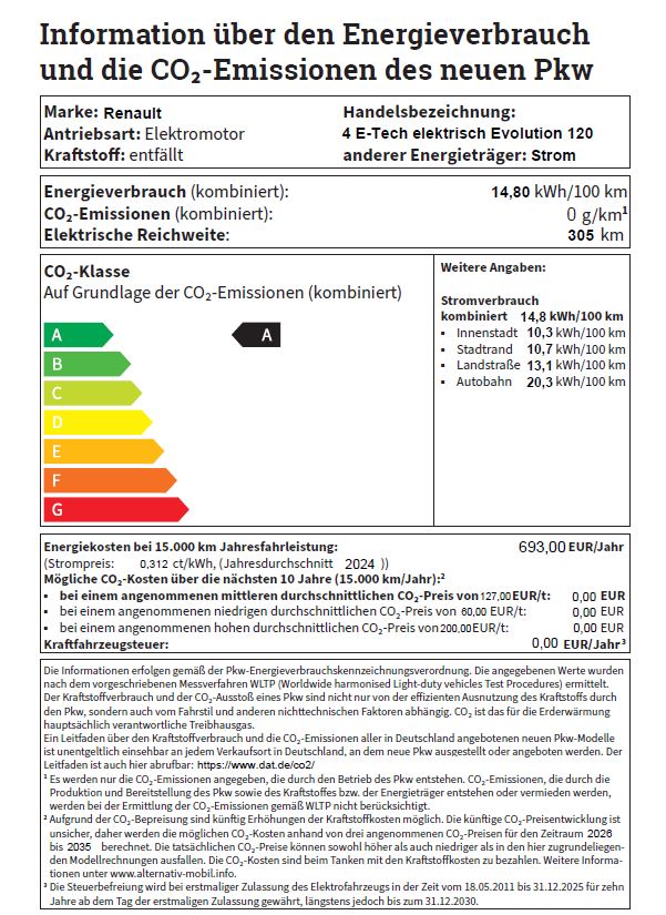 Renault 4 E-Tech 100% elektrisch Evolution 120: Gesamtverbrauch kombiniert (kWh/100 km): 14,8; CO2-Emission kombiniert (g/km): 0; CO2-Klasse: A.